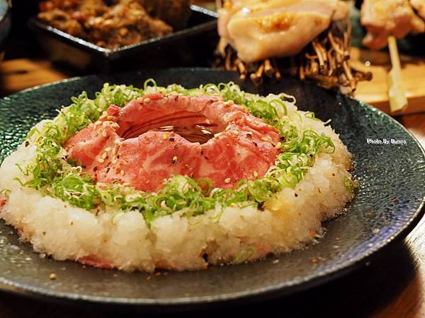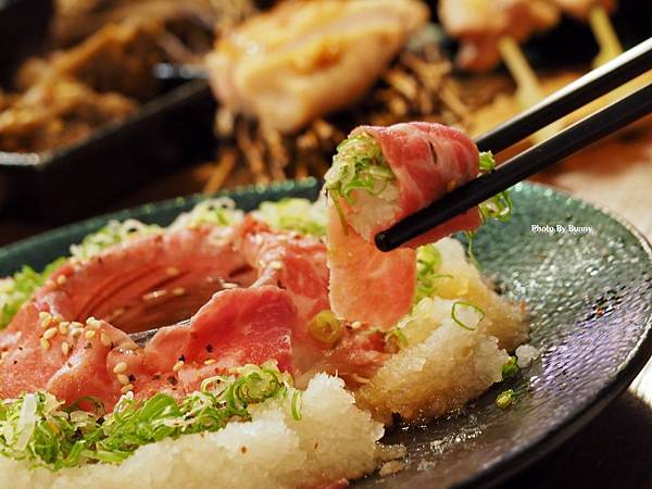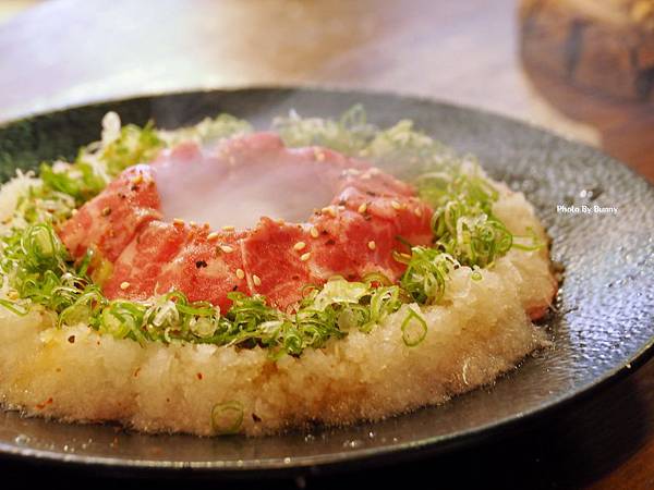 食用時直接將生牛肉捲起蘿蔔泥及蔥花,